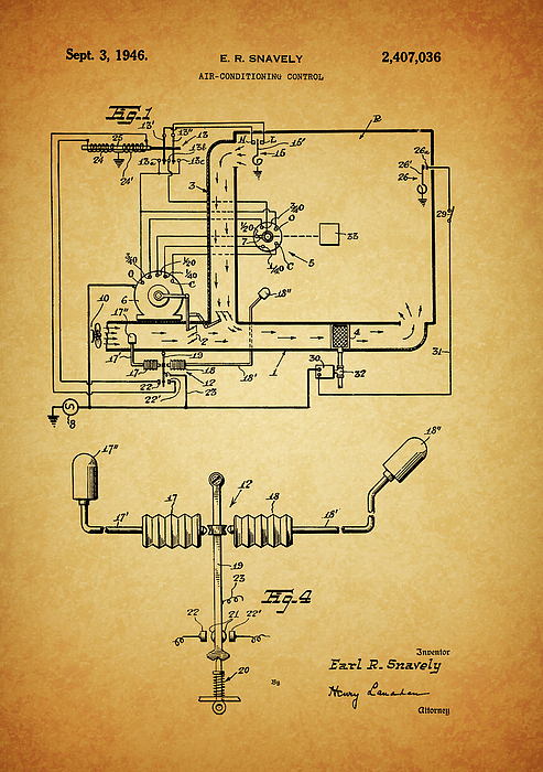 Vintage 1946 thermostat design illustration fully restored on aged paper. This patent drawing would be a great addition for anyone in HVAC.
