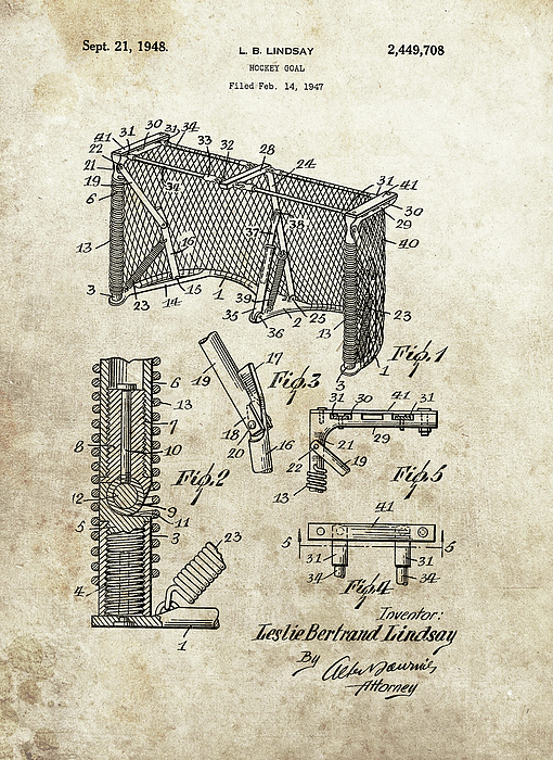 Vintage 1948 ice hockey goal patent fully restored on aged paper. A unique and historical print for anyone who loves hockey or is interested in sports history.