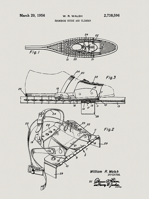 Vintage 1956 snowshoe patent fully restored on aged paper.