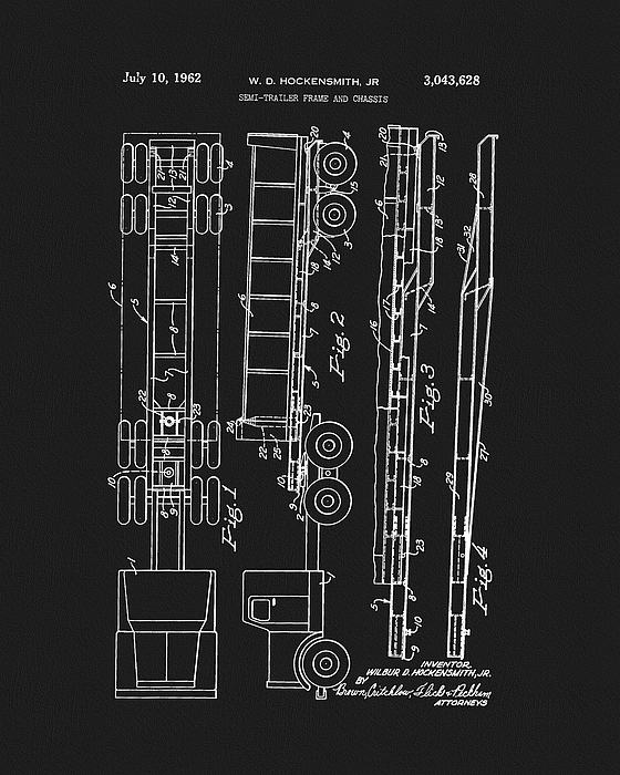 Vintage 1962 semi truck patent design fully restored on black canvas. This unique antique drawing is a great addition for any trucker or trucking company.