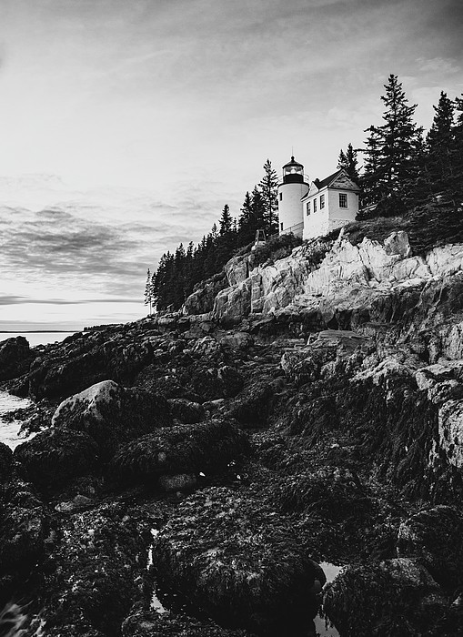 Black and white photograph of the iconic Bass Harbor Head Light in Acadia National Park, Maine. Capturing this image towards the end of the day allowed for more contrast enhancing the black and white.