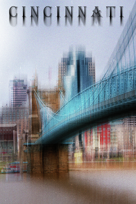 Fine art textured image of the iconic Cincinnati, Ohio skyline and Roebling Bridge with intentional camera movement for an abstract approach.