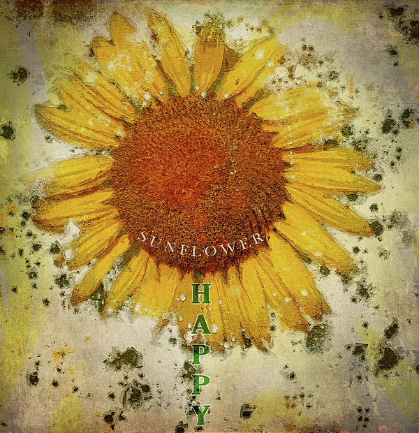 A beautiful grunge style print of a painted sunflower with the word happy as the green stem. A unique and colorful piece for anyone who loves... more
