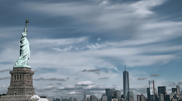 Panorama style photograph of the Statue Of Liberty looking over the New York City skyline. A great image for those who love New York!
