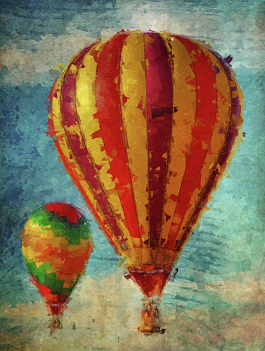 Retro impressionistic style painting of two hot air balloons launching into the sky. This unique and colorful painting is sure to add a pop to any room or office.