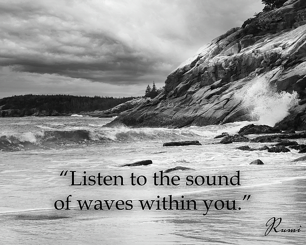 An original black and white image of waves crashing along the shore of Acadia National Park as a storm approaches. This inspirational message by Rumi felt like a fitting message for this photograph.