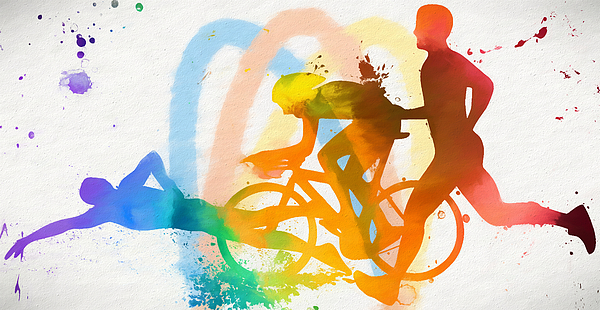 Color splash painting print of triathlon athletes going through their competition. This unique work would be a great addition for any triathlon competitors.